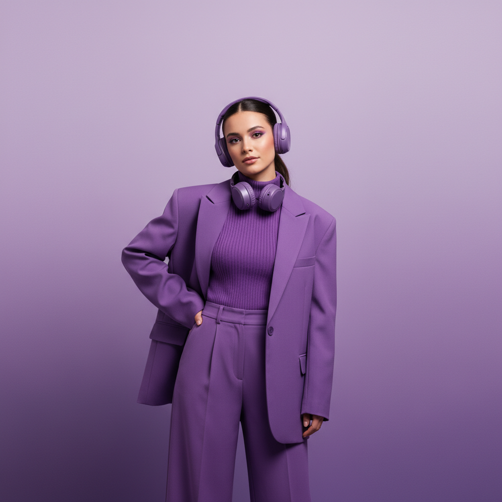 Portrait éditorial mode monochrome violet avec style studio professionnel